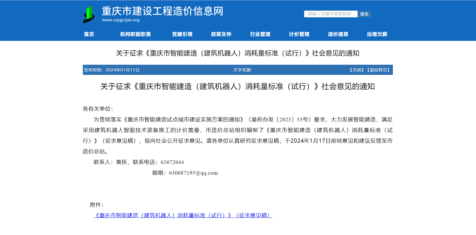 为贯彻落实《重庆市智能建造试点城市建设实施方案的通知》(渝府办发〔2023〕53号)要求,大力发展智能建造,满足采用建筑机器人智能技术装备施工的计价需要,市造价总站组织编制了《重庆市智能建造(建筑机器人)消耗量标准(试行)》(征求意见稿),现向社会公开征求意见。请各单位认真研究征求意见稿,于2024年1月17日前将意见和建议反馈至市造价总站。