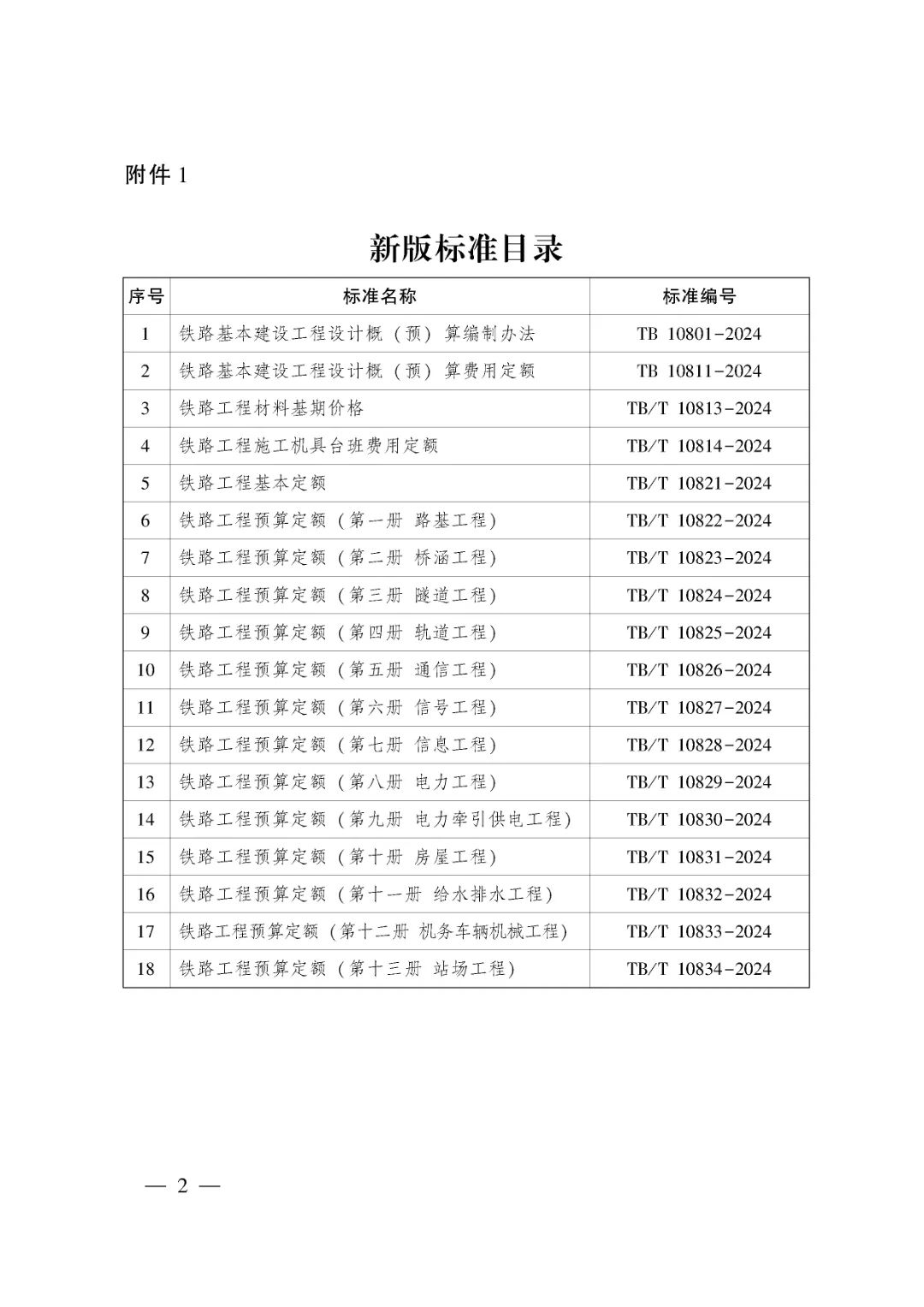 现公布《铁路基本建设工程设计概 (预) 算编制办法》TB10801-2024等18项铁路工程建设标准 ( 详见附件1),自2025年1月1日起实施。《铁路基本建设工程设计概 (预) 算编制办法》(TZJ1001-2017) 等21项标准 (详见附件2) 同时废止。